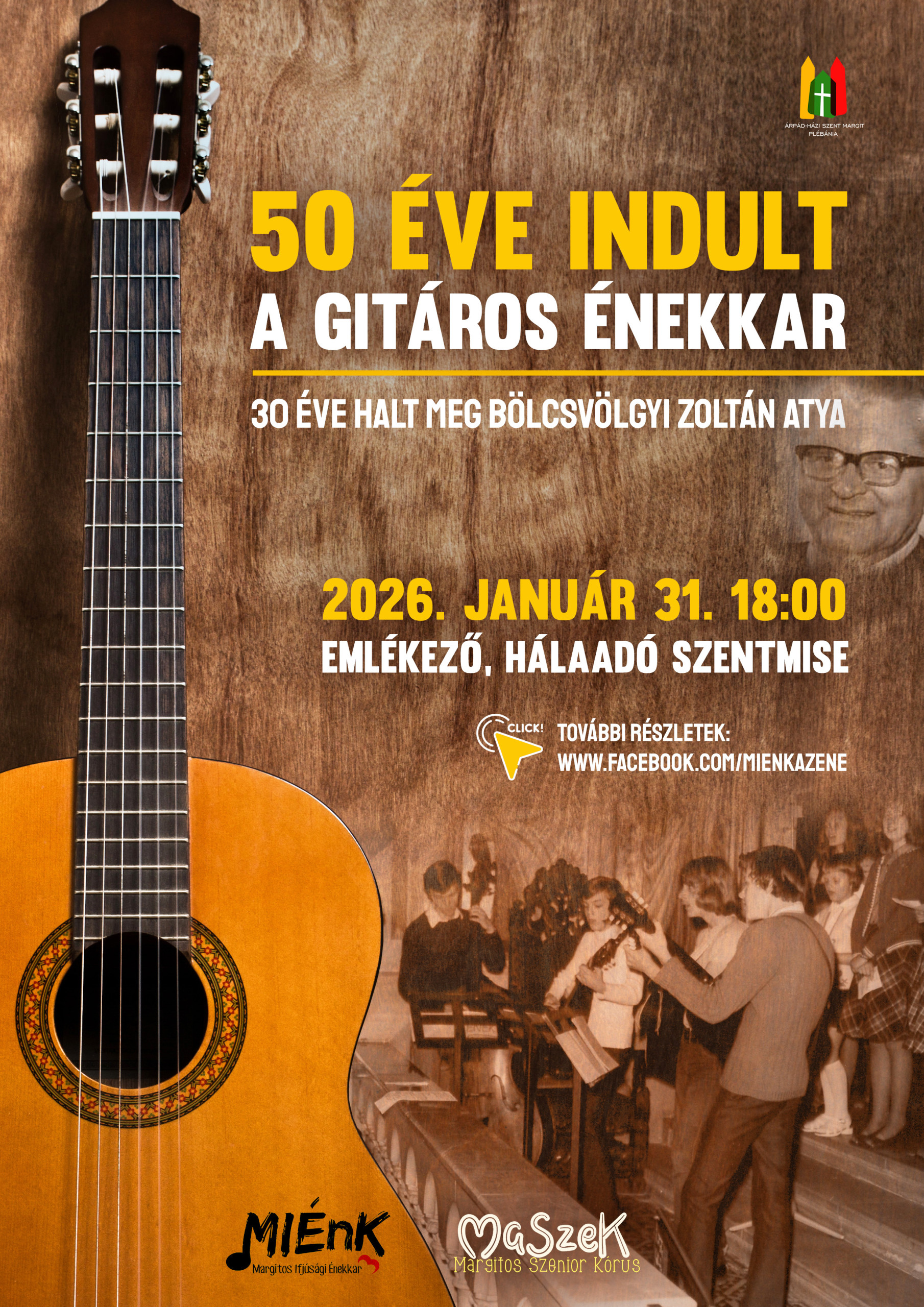 Gitáros énekkarunk 50 éve kezdte meg szolgálatát templomunkban. Bölcsvölgyi Zoltán atya 30 évvel ezelőtt költözött a mennyei hazába. E két évfordulót a jelenleg működő énekesek - zenészek vezetésével az elmúlt évtizedek résztvevőivel együtt, közös zenei szolgálattal, ünnepi szentmisével ünnepeltük 2026. január 31-én 18 órakor.