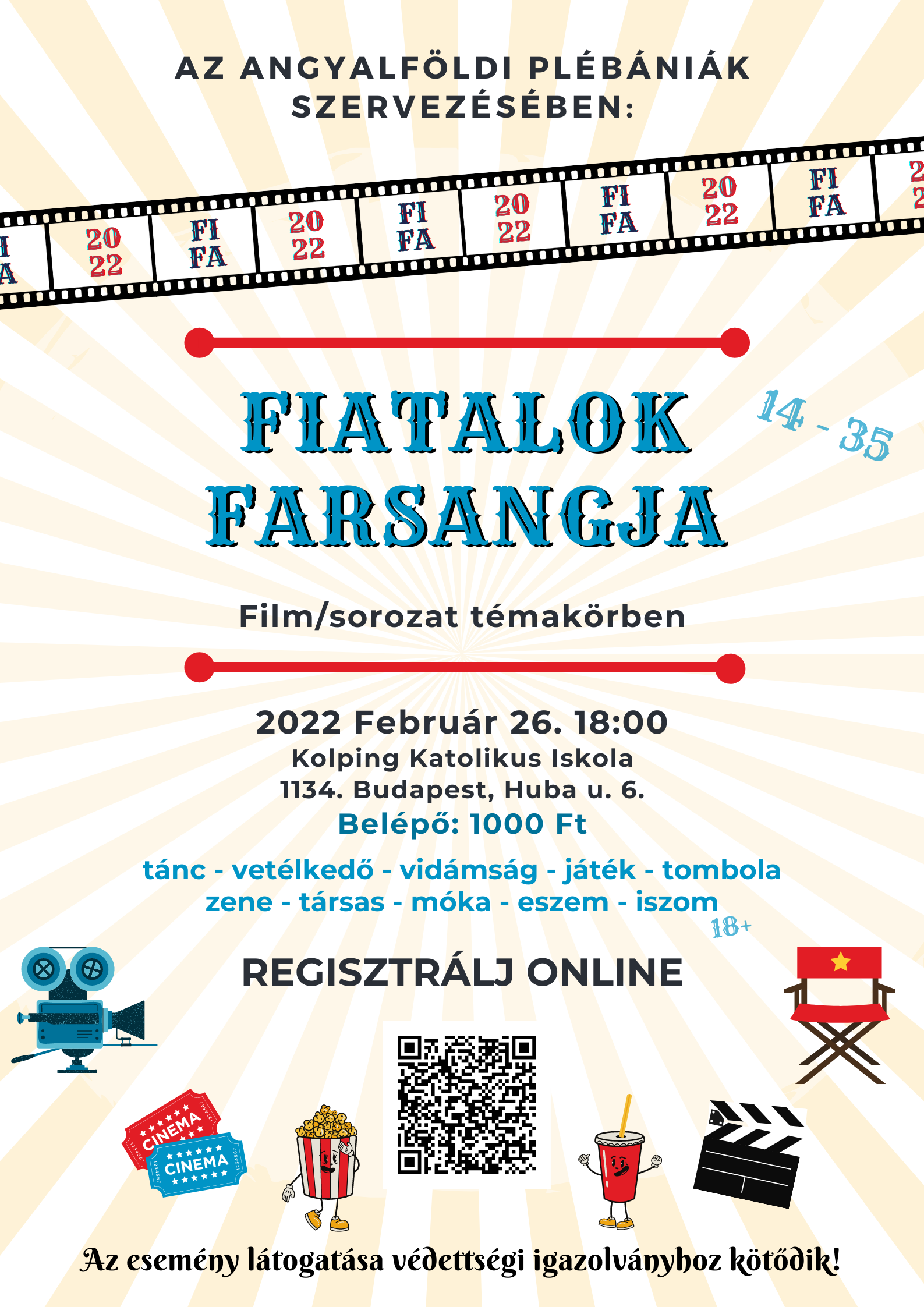 Szeretettel várunk minden 14 és 35 év közötti fiatalt egy szuper farsangra! Február utolsó szombatján, 26-án, 18.00 órától hajnalig lesz a mulatság játékokkal, vetélkedővel, tánccal, vidámsággal. Szeretettel hívjuk plébániánk fiataljait, ahol a többi angyalföldi plébánia fiataljaival fogunk farsangolni. Az esemény védettségi igazolványhoz kötött.