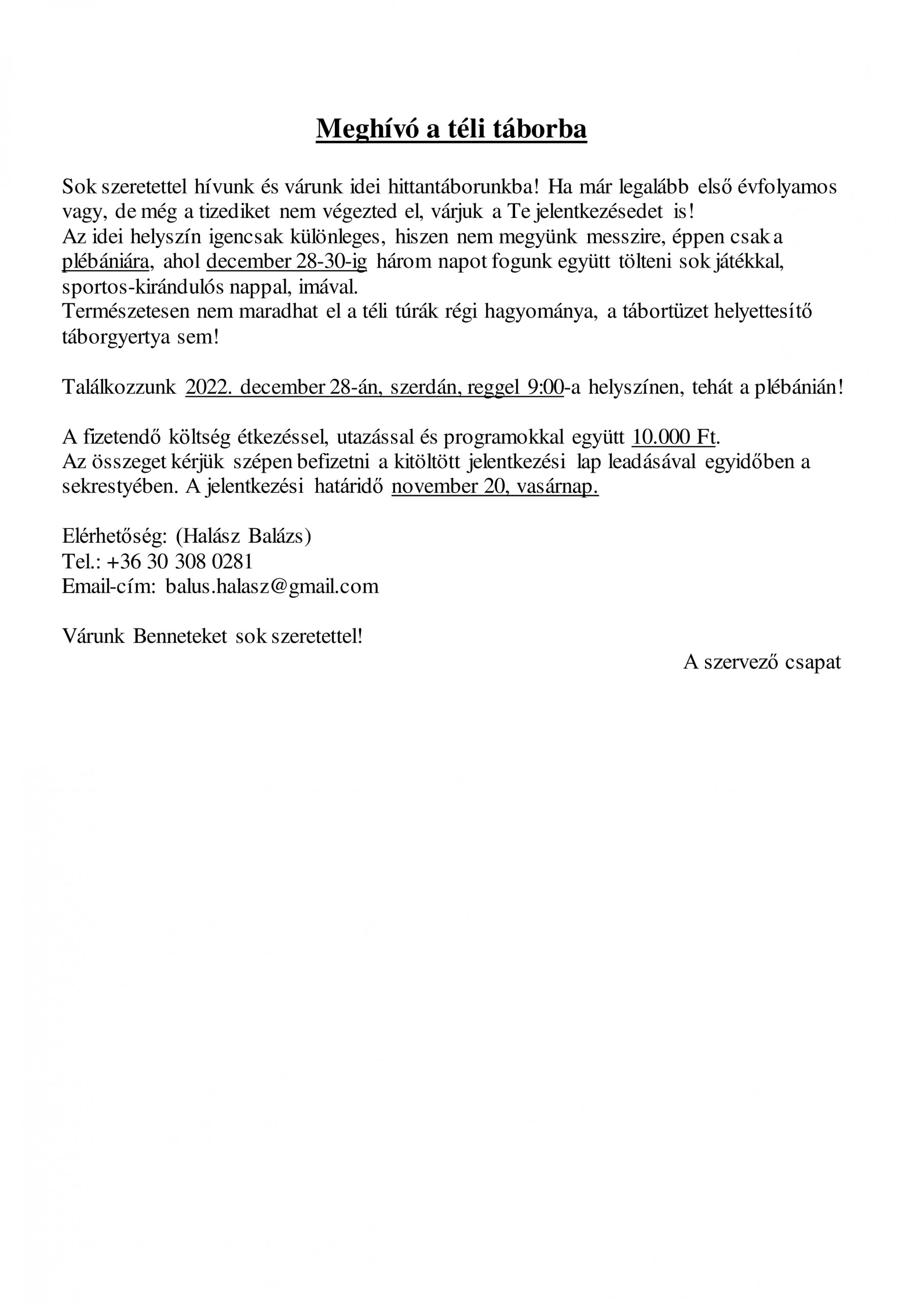 Sok szeretettel hívjuk és várjuk téli hittantáborunkba mindazokat a gyerekeket és fiatalokat, akik már legalább elsősök, de még nem végezték el a tizedik osztályt. A helyszín különleges, hiszen plébániánkra fogunk „elutazni” ottalvós táborba, ahol december 28-30-ig három napot töltünk együtt sok játékkal, kirándulással és imával. A tábor költsége étkezéssel, utazásokkal és programokkal együtt 10.000 Forint. Meghívót és jelentkezési lapot a sekrestyében lehet kérni, ez utóbbit ugyanide is kell visszahozni a befizetendő összeggel együtt november 20., vasárnapig. Szeretettel várjuk a jelentkezéseket!