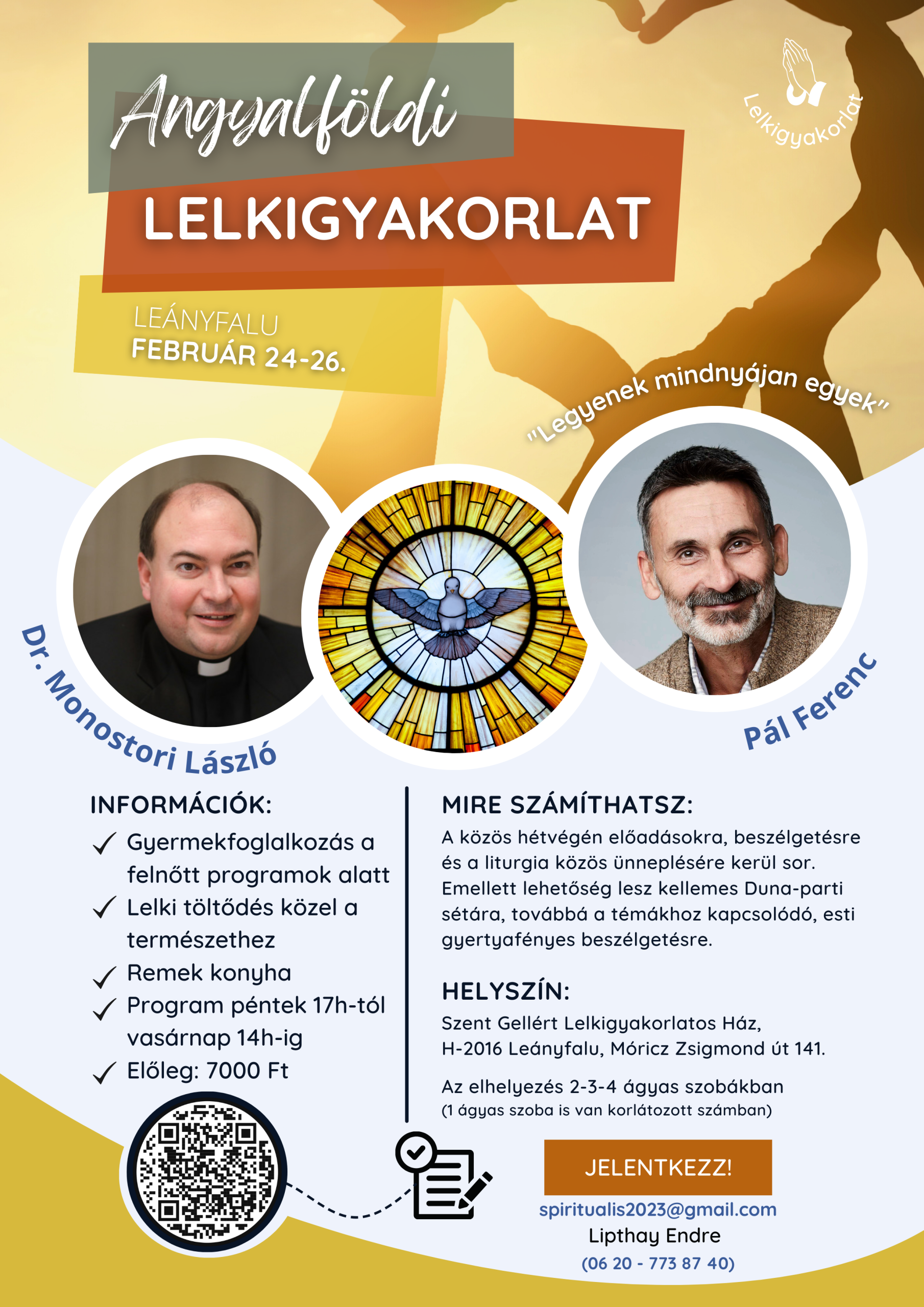 Legyenek mindnyájan egyek címmel angyalföldi lelkigyakorlatra hívjuk Testvéreinket február 24 és 26. között a leányfalui lelkigyakorlatos házba. Tanítást hallhatunk Monostori László és Pál Feri atyáktól. A közös hétvégén előadásokra, beszélgetésre és a liturgia közös ünneplésére kerül sor. Jelentkezni a spiritualis2023@gmail.com címen vagy a +36 20 773 8740-es telefonszámon lehet Lipthay Endrénél, a Szent Mihály Plébánia önkéntesénél.