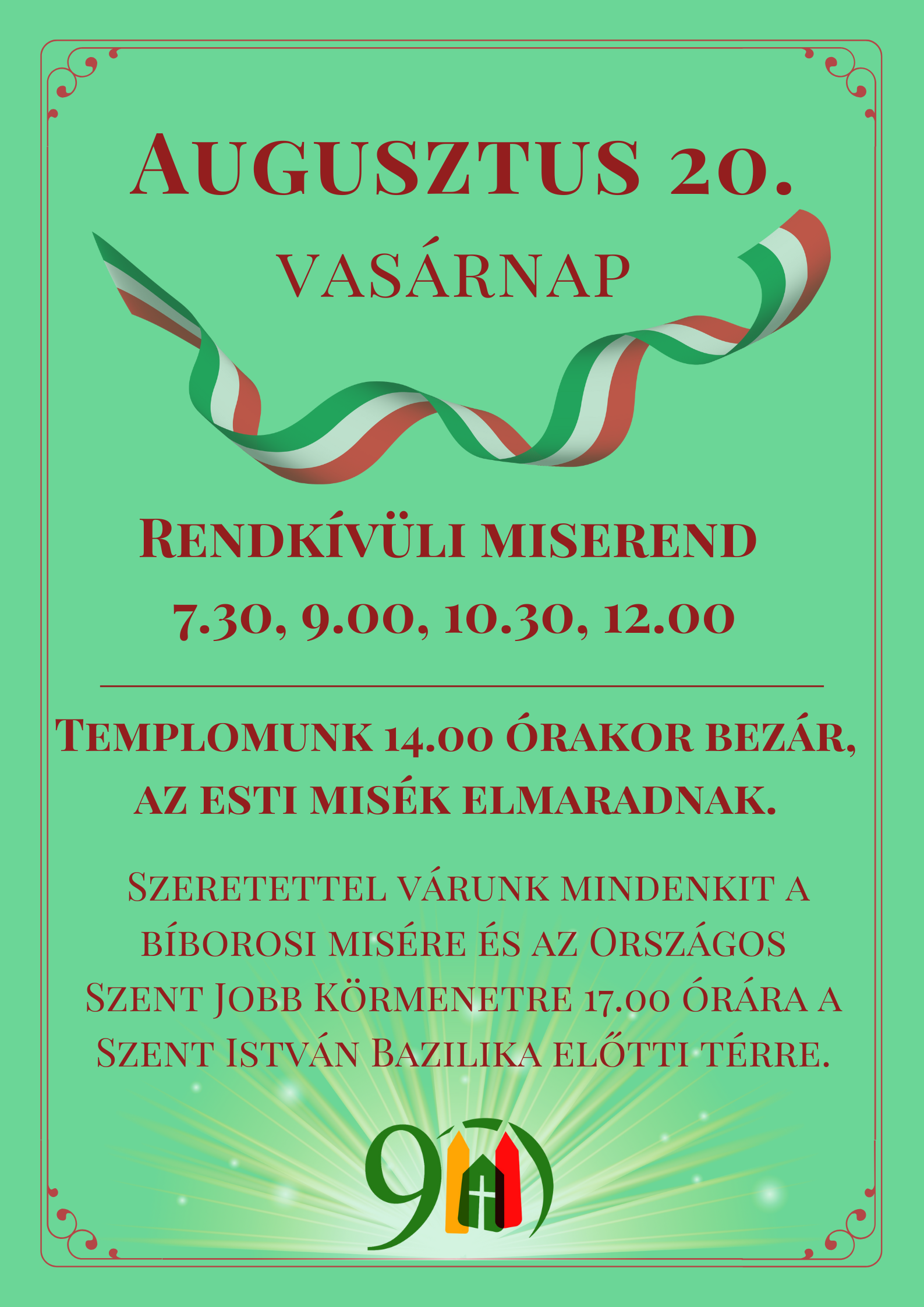 Az Országos Szent Jobb Körmenet miatt ezen a napon esti miséink elmaradnak. Mindenkit bátorítunk a 17.00 órakor a Szent István Bazilika előtti téren kezdődő bíborosi szabadtéri misén és a körmeneten való részvételre.