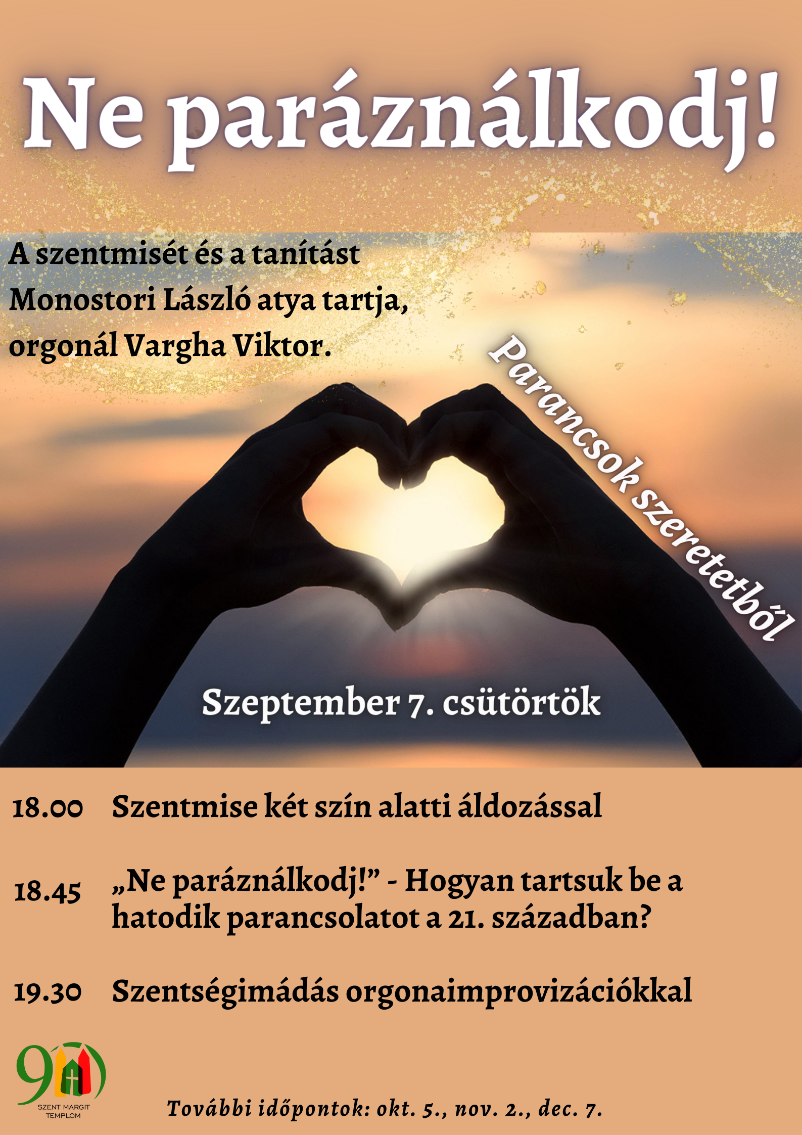 A nyári szünet után folytatjuk a Parancsok szeretetből című felnőtteknek szóló lelki est sorozatot. Szeptember 7-én, csütörtökön 18.00 órától szentmisét ünneplünk két szín alatti áldozással, majd a Ne paráználkodj! parancsról fogunk közösen elmélkedni. Ezt szentségimádás követi Vargha Viktor orgonaimprovizációival. Szeretettel várunk mindenkit!