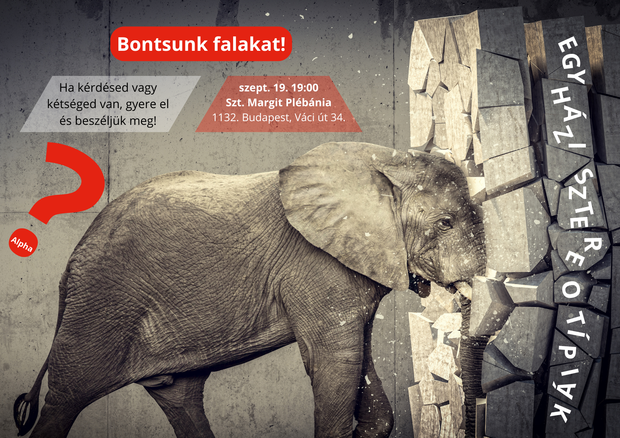 Az Alpha Kurzus világszerte sok ember életét megváltoztatta, falak dőltek le bennük a hittel kapcsolatosan. Egy igazi kalandra hív téged és mindenkit, aki kíváncsi az élet és a hit nagy kérdéseire. Fedezd fel az élet értelmét és a keresztény hitet egy inspiráló és befogadó közösségben. Szólj és hozd magaddal a barátaidat is.