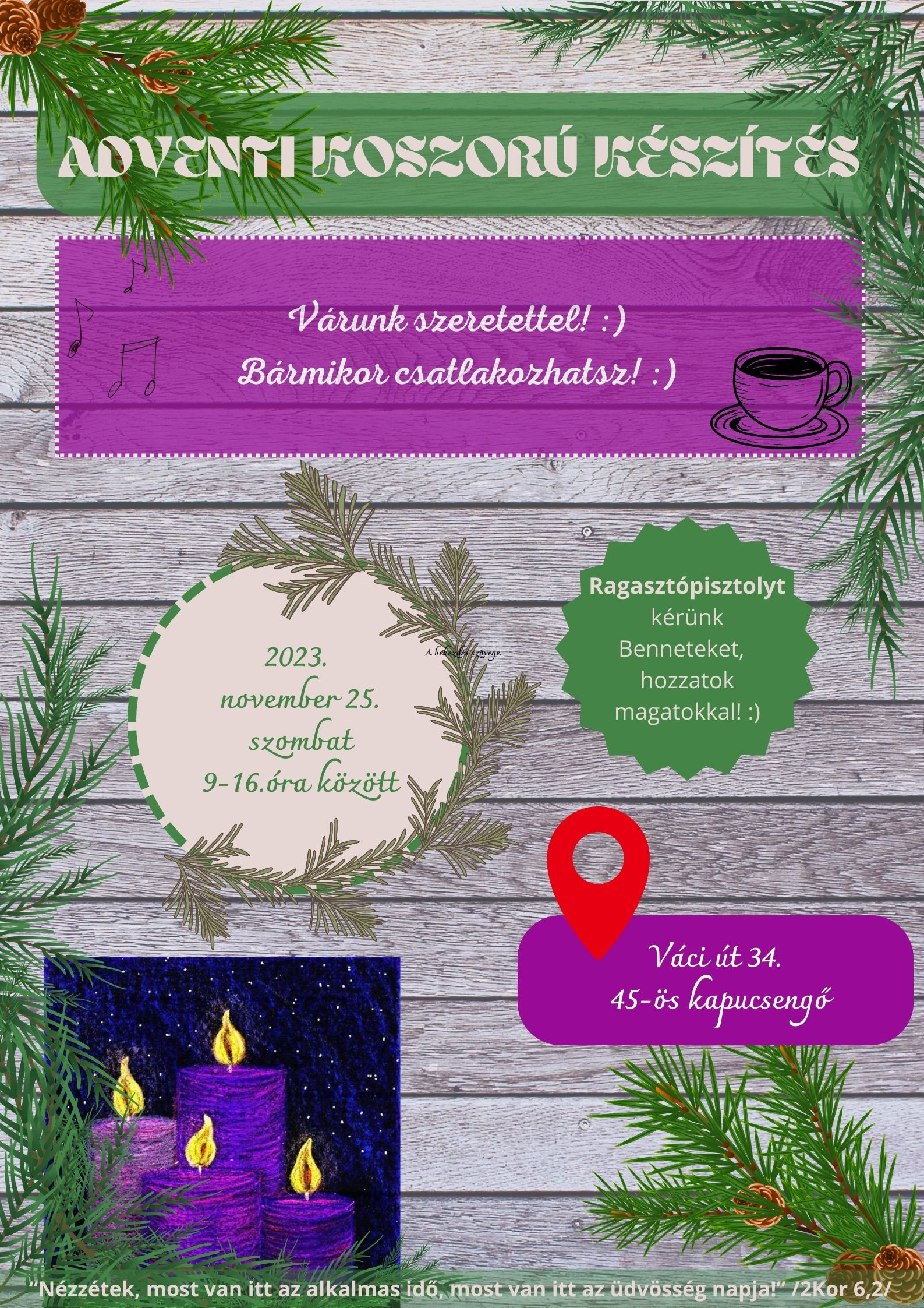 Szeretettel várunk mindenkit egy jó hangulatú közös adventi koszorú kötésre a plébániára november 25-n, szombaton. Előzetes jelentkezés nem szükséges, 9.00 és 16.00 óraközött bármikor lehet jönni. Aki tud, hozzon magával ragasztópisztolyt!