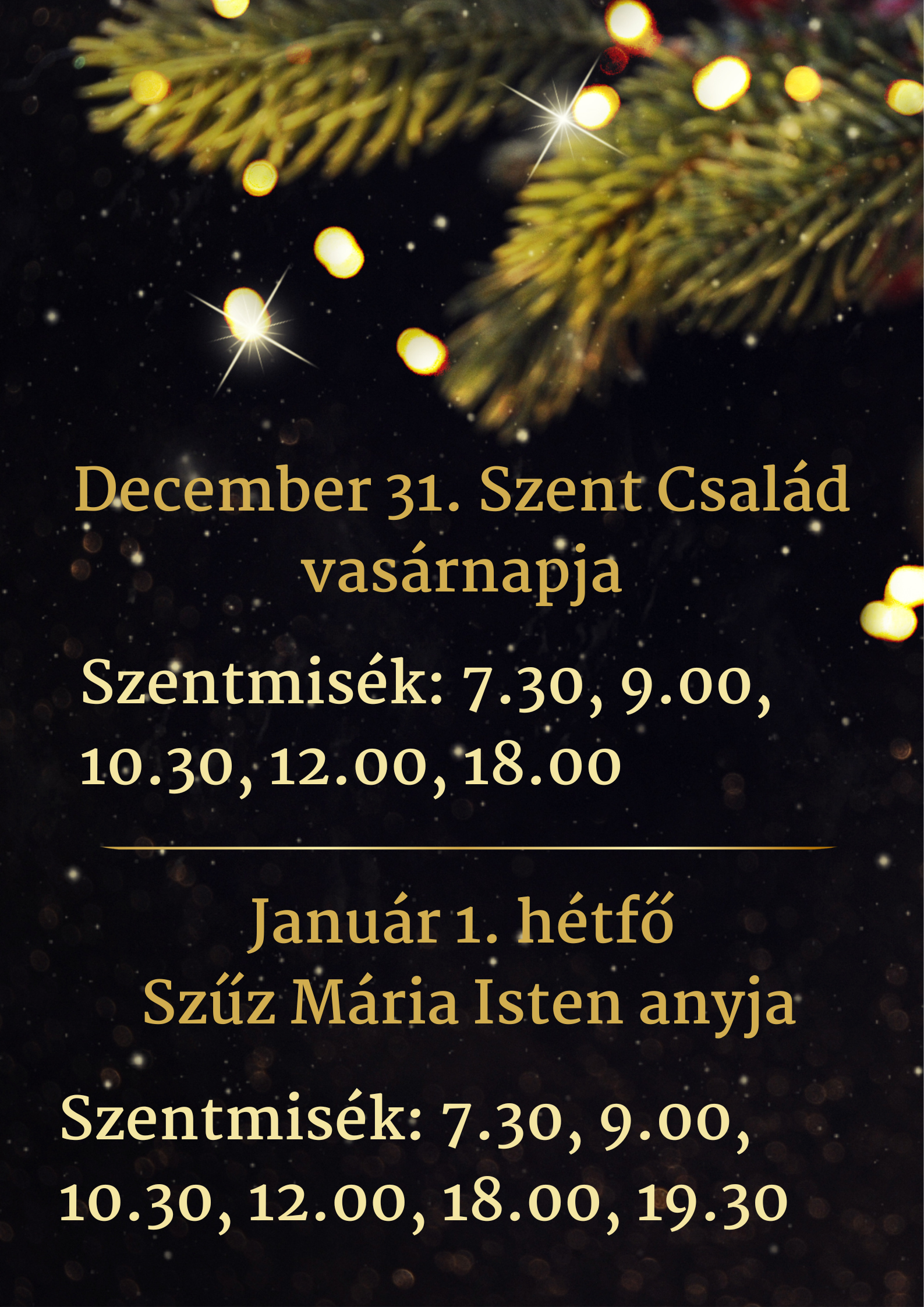 Január 1-én, Szűz Mária, Isten anyja kötelező ünnepét misén való részvétellel ünnepeljük, ezért templomunkban a vasárnapi rend szerint lesznek a szentmisék.