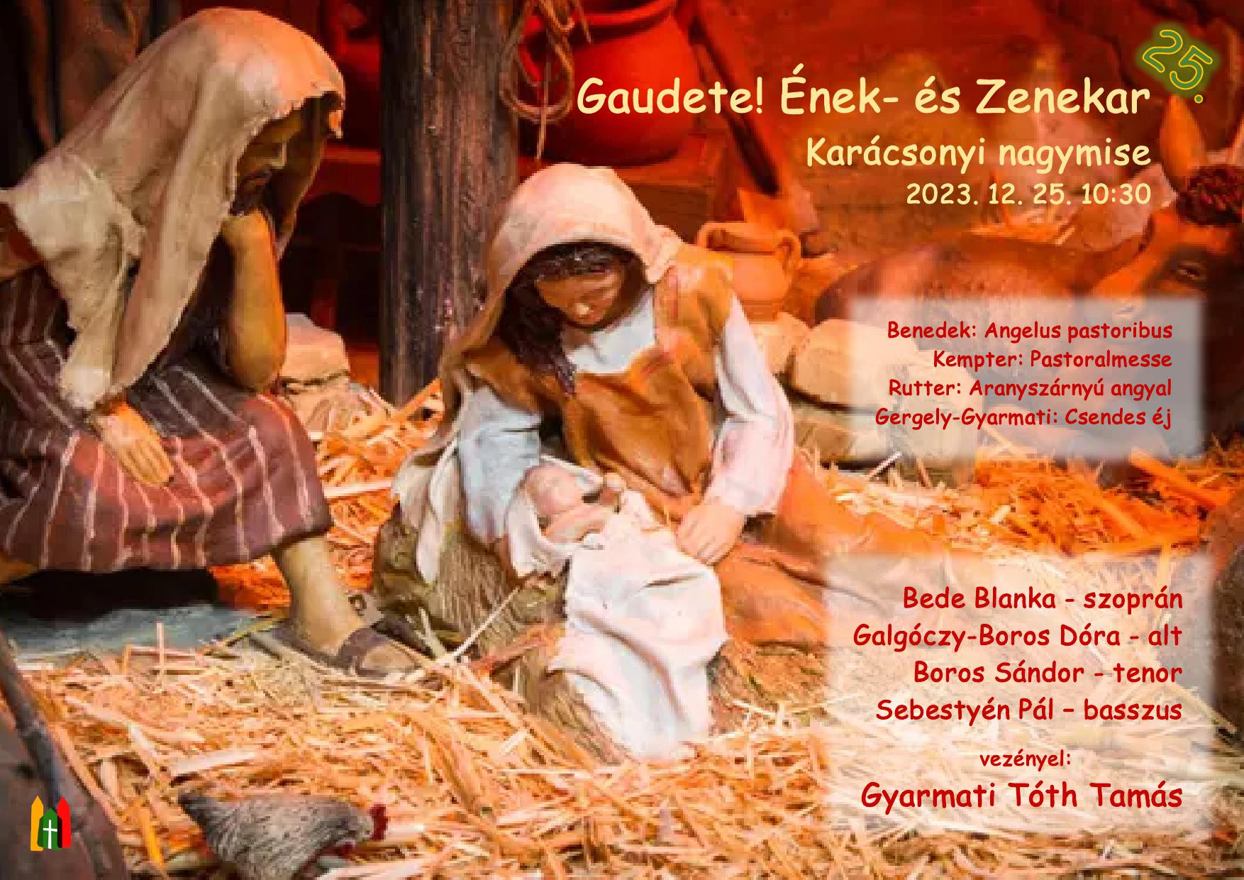 A szentmisén a 25. jubileumi évadát ünneplő Gaudete! Ének- és Zenekar végezte a zenei szolgálatot. Az elhangzott műveket és a közreműködő szólisták névsorát az alábbi plakáton olvashatjátok. A zenei programból két tétel hangfelvételről utólag meghallgatható: