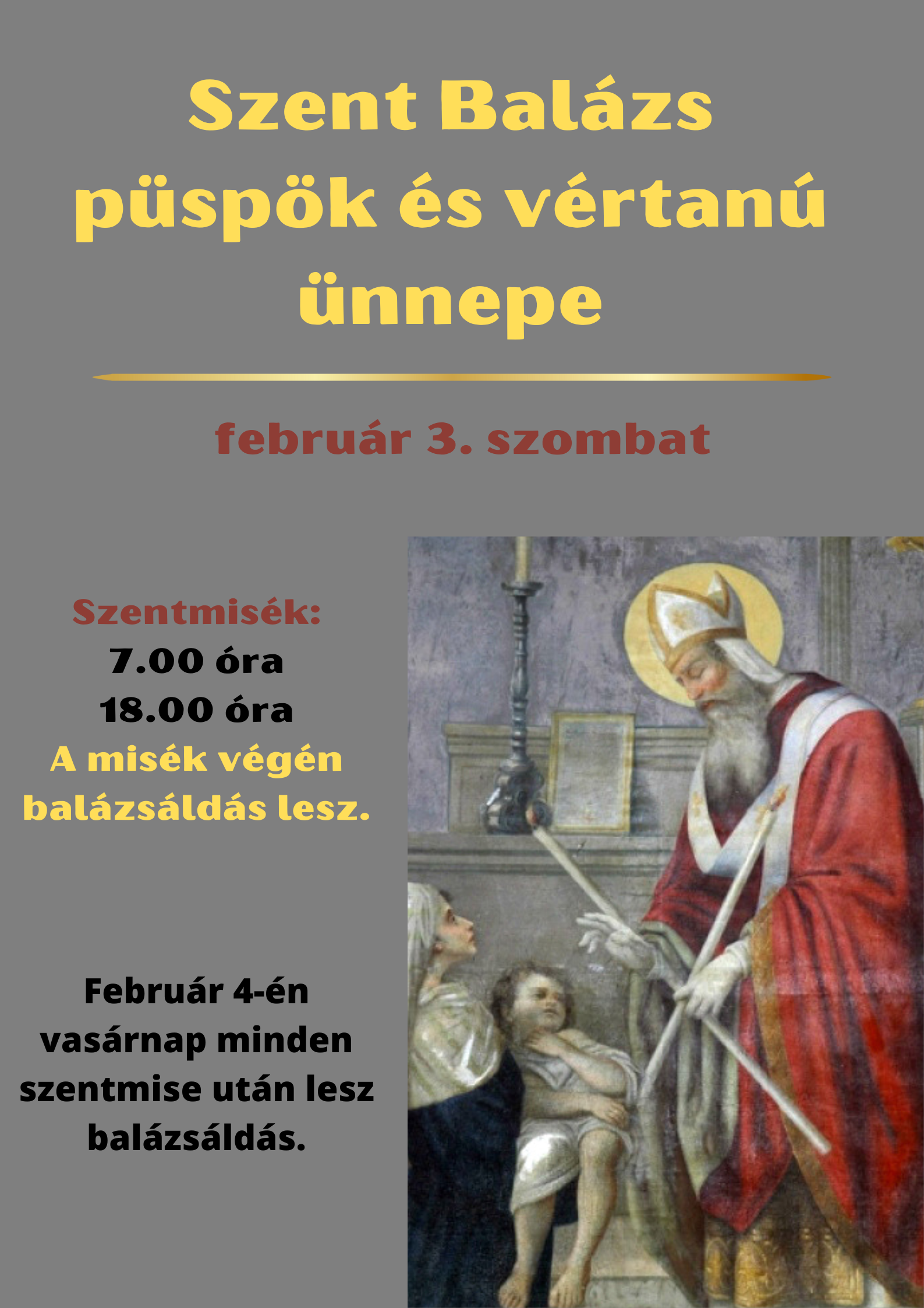 Ebből az alkalomból Testvéreink balázsáldásban részesülhetnek szombat este és vasárnap a szentmisék után.
