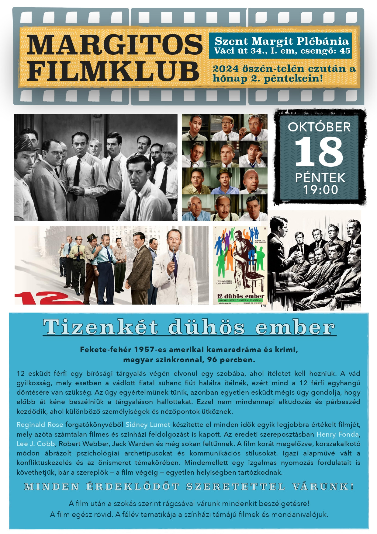 A Tizenkét dühös ember c. filmet fogjuk megnézni. A film végén mindenkit marasztalunk egy közös beszélgetésre, kötetlen együttlétre.