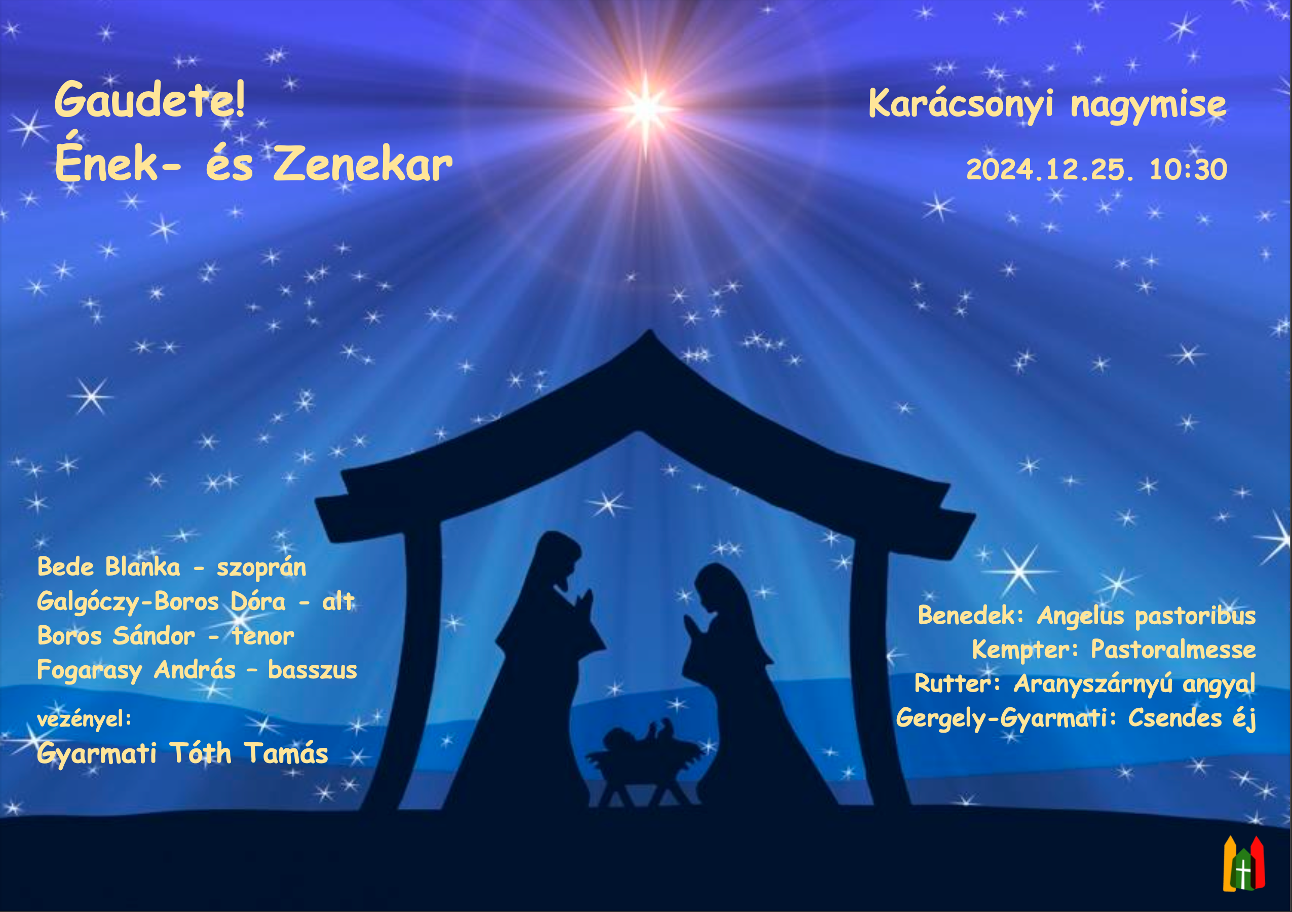 Karácsony ünnepén a 10.30 órakor kezdődő szentmisén templomunk énekkara zenekari kísérettel szólaltatta meg az ünnepi liturgiát kísérő klasszikus zenedarabokat. A szentmisén énekes szólisták is közreműködtek, a zenei együttest Gyarmati Tóth Tamás karnagy vezényelte.