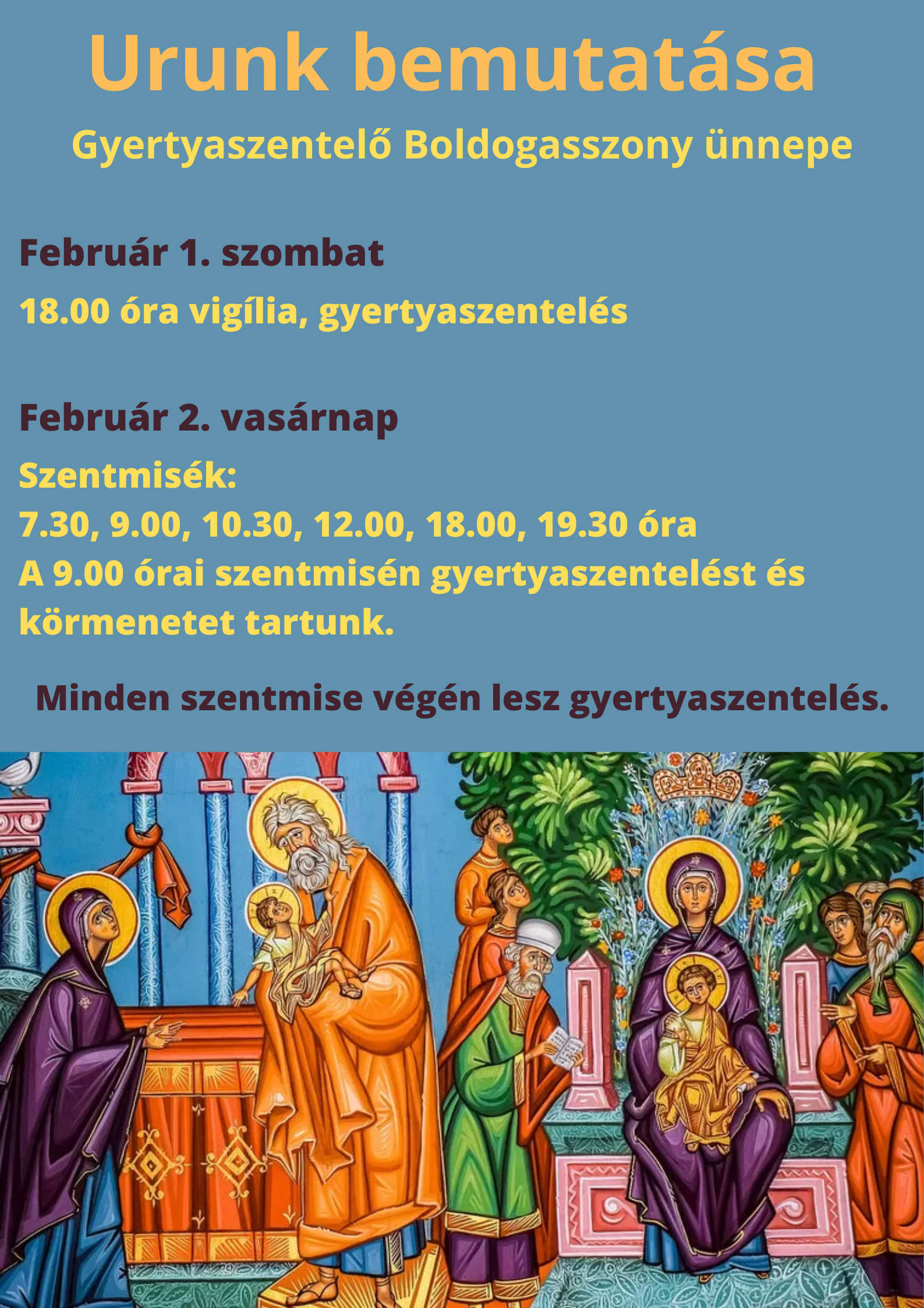 Február 2-án lesz Gyertyaszentelő Boldogasszony ünnepe, és külön öröm, hogy idén vasárnapra esik. Éppen vasárnap minden misén tartunk gyertyaszentelést. Aki szeretne, hozhat magával gyertyát, de az előtéri információs ponton is lesz lehetőség a gyertyák beszerzésére minden mise előtt.